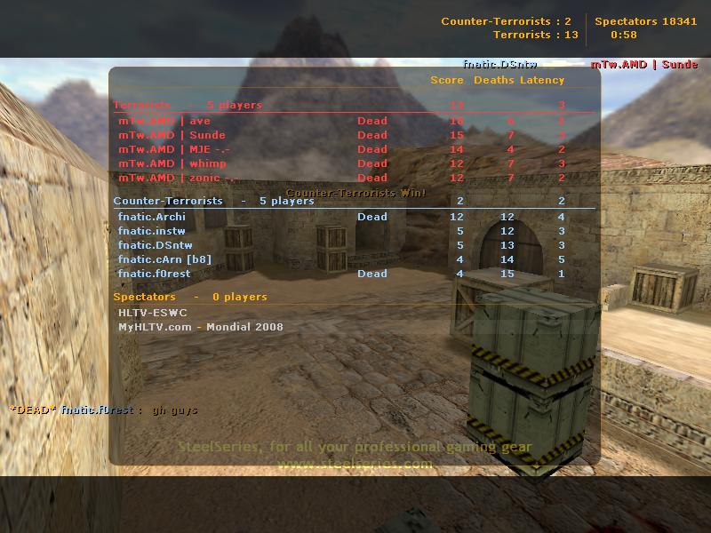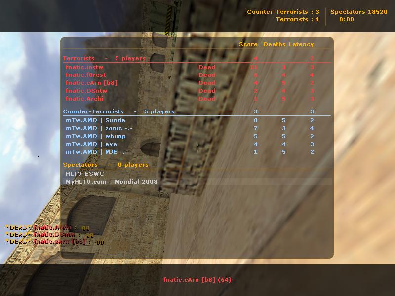 Об игре: Никакого чата, ни секунды отвлечения, предельная сосредоточенность, великолепный aim, строго отработанная тактика и блестящий team play. А что вы хотели? Это финал ESWC Masters 2008. Нас ожидают быстрые красивые, тактически отработанные раунды в исполнении двух, наверное, самых стабильных команд Европы – Fnatic и Mtw.